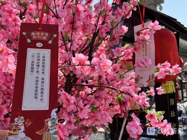 “足不出户、工作轻松,只需动动手指即可月入过万……这就是网络刷单诈骗!”在“海州·花朝节”活动现场,反诈宣传摊位前围满了猜谜的市民游客,他们认真阅读、仔细揣摩,然后争相回答谜底,领取精美礼品。“游玩+反诈”的宣传形式,新颖别致,很快便吸引了游客。