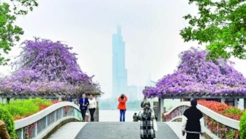 昨天,南京玄武湖公园紫藤花盛放,随风摇曳的紫色花海如瀑布般倾泻而下,送来缕缕清香,吸引市民拍照打卡。记者 孙中元 摄