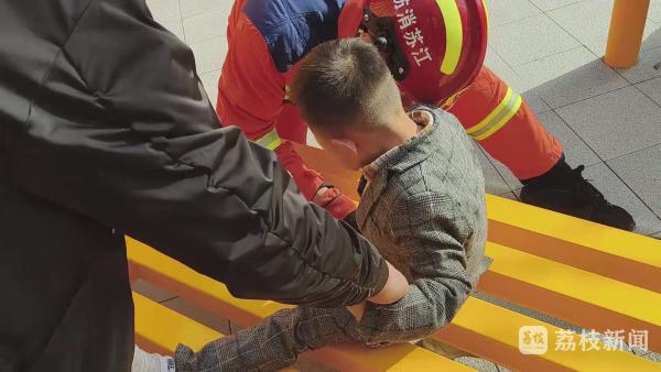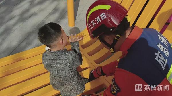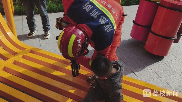 消防救援人员到场后,经过现场查看发现,小男孩的右腿卡在了小区娱乐设施的缝隙间。由于害怕,孩子一直在哭喊。消防救援人员一边安慰孩子的紧张情绪,一边展开救援工作。