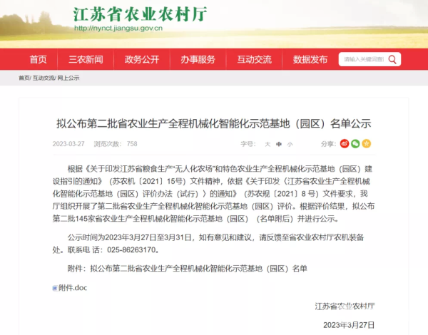 据悉,经省评选入列的示范基地引领效果好,它们在基地规划、设施“宜机化”、农机装备、机艺融合、机信融合等方面具有一定典型示范意义,可成为江苏省农业生产全程机械化智能化发展的标杆和典范。