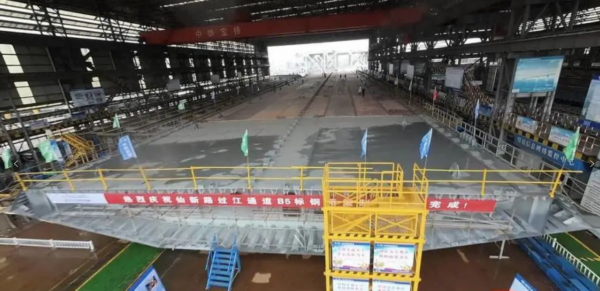 这些钢箱梁全部采取后场预制、现场吊装,每个标准段宽31.5米,长18米,高4米,可以在桥面上举办篮球赛。钢箱梁的“肚子”中间还有两个拱形门,这是留给未来检修用的通道。目前主桥钢箱梁已全部拼装完成,预计4月中下旬发运至桥位现场。