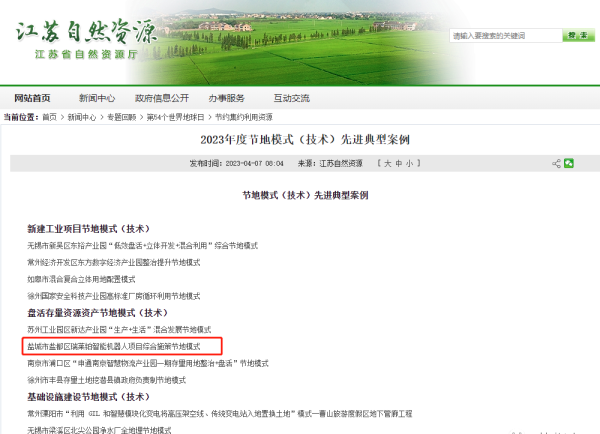 近日,江苏省自然资源厅公布《2023年度节地模式(技术)先进典型案例》,盐城市盐都区瑞莱铂智能机器人项目综合施策节地模式成功入选盘活存量资源资产节地模式(技术)先进典型案例,全省仅10家,盐城唯一。