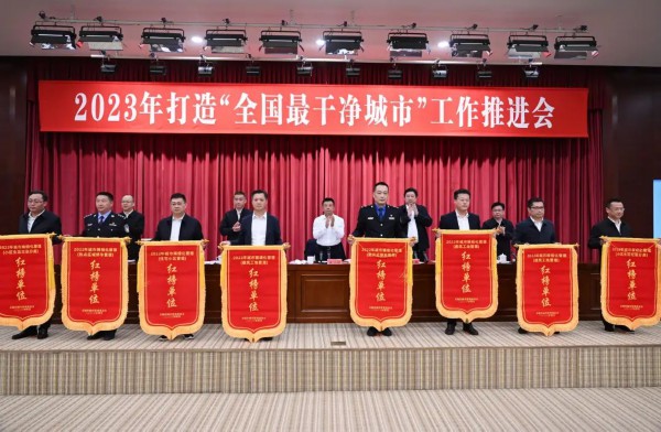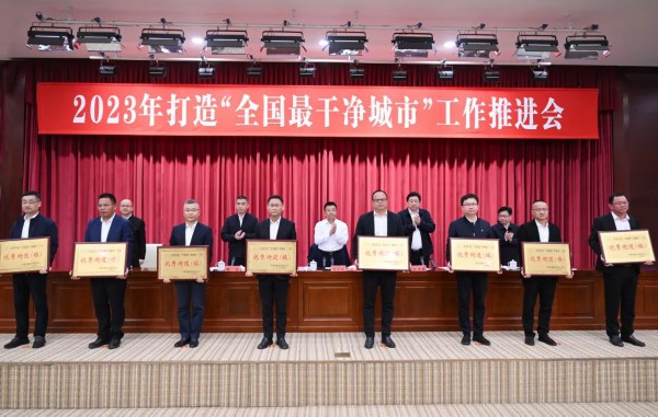 会议对2022年度打造“全国最干净城市”工作优秀街道(镇)和城市精细化管理“红榜”单位进行表扬和授奖,向各板块下达今年城市精细化管理工作目标任务书。