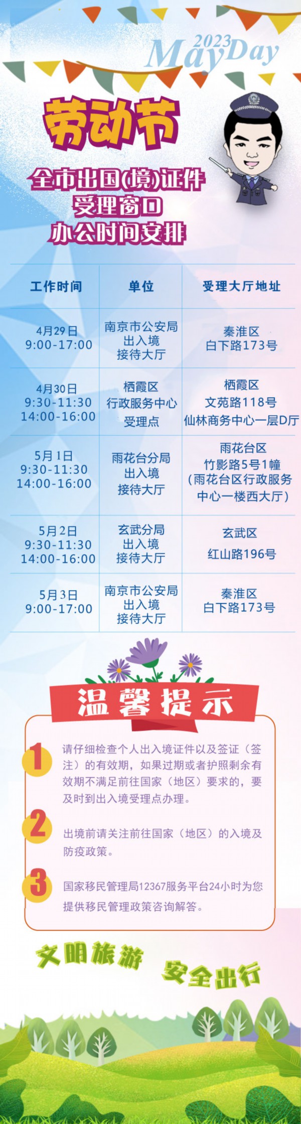 答:五一期间全市出入境窗口轮流对外开放,具体信息如图。