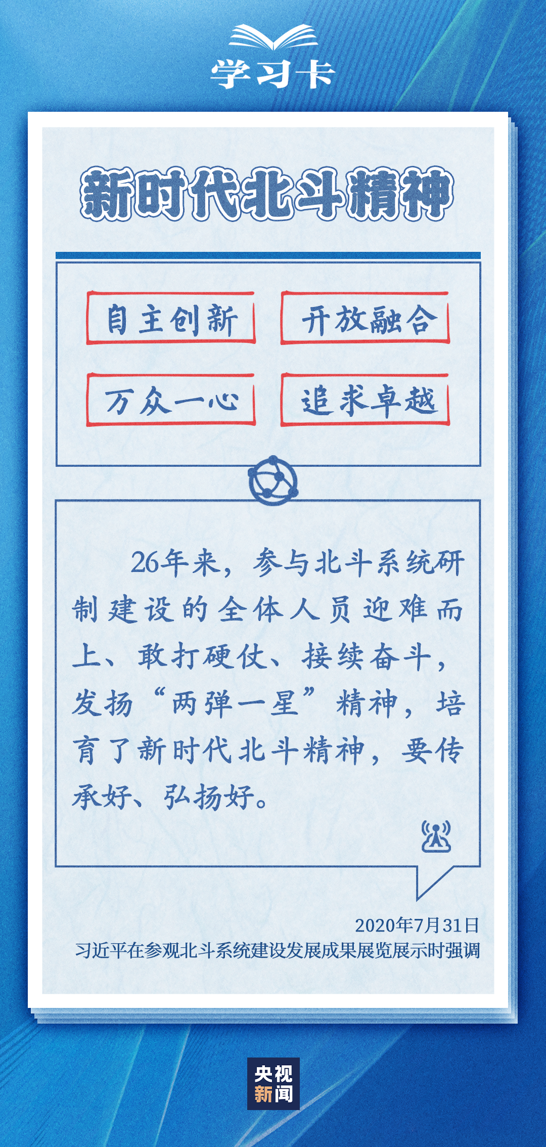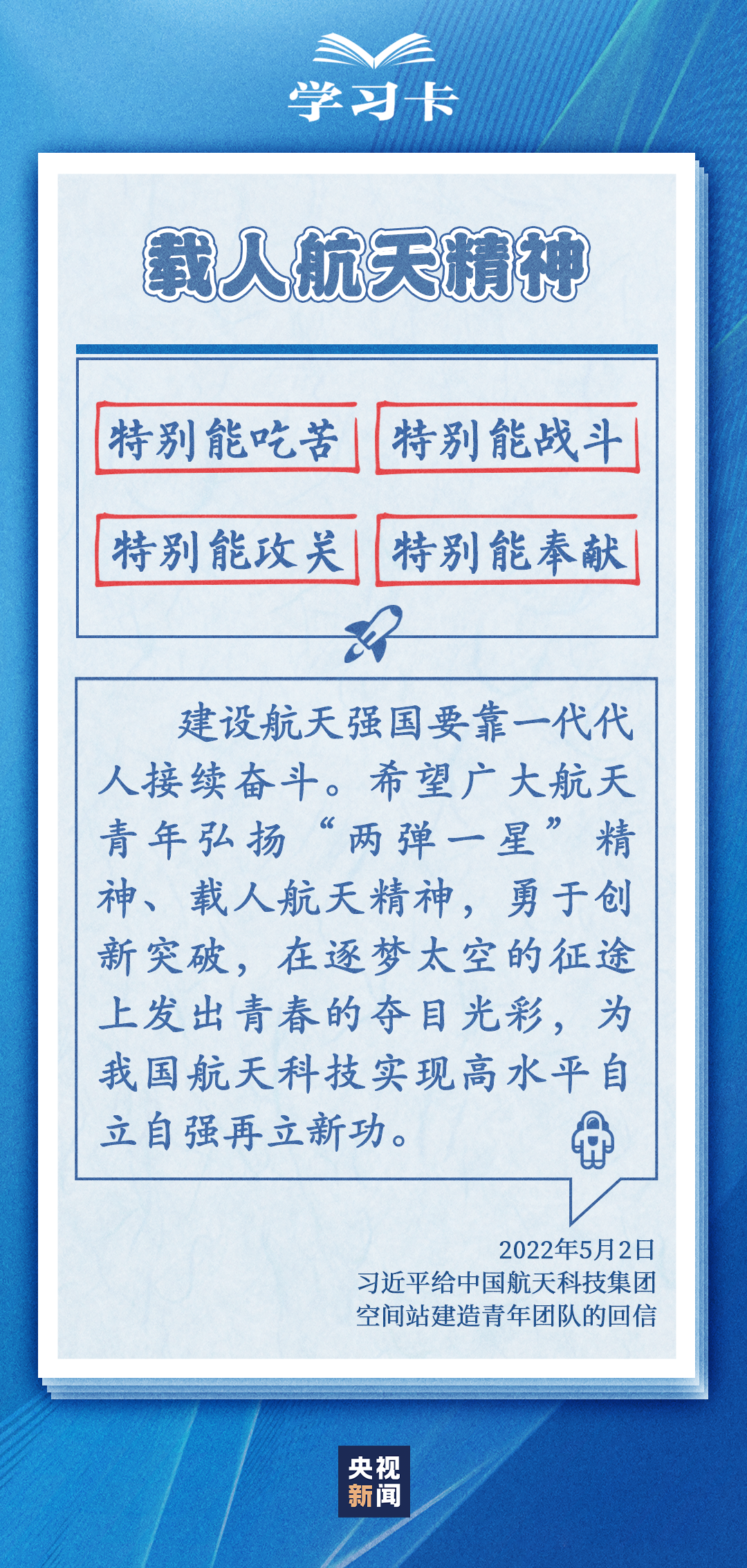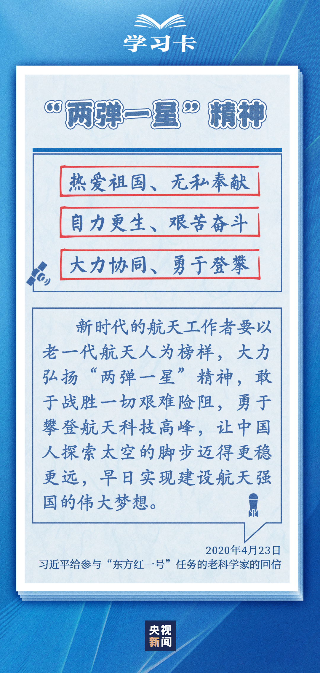 在中国航天事业的长期奋斗中,航天工作者通过接续奋斗铸就的“两弹一星”精神、载人航天精神、探月精神、新时代北斗精神等,激励着中国航天人不断攀登新的高峰。今天(4月24日)是第八个中国航天日,一起学习航天人的宝贵精神财富↓