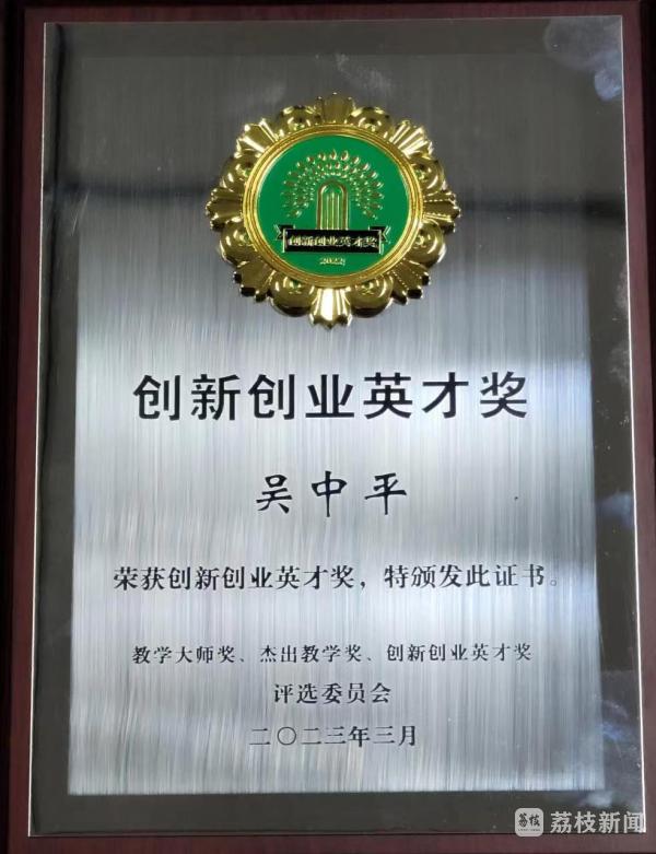 据悉,在本月举行的“第四届教学大师奖、杰出教学奖和创新创业英才奖”颁奖典礼上,吴中平荣获2022年度创新创业英才奖,是10名创新创业英才奖获奖者中唯一的高职院校毕业生,是江苏高职院校毕业生首次获此殊荣。