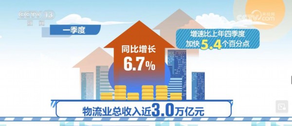 一季度,物流业总收入近3万亿元,同比增长6.7%,增速比上年四季度加快5.4个百分点,物流市场规模增速升至近期较高水平。