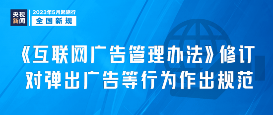 新修订的《互联网广告管理办法》5月1日起施行,其对人民群众反映集中的弹出广告、开屏广告、利用智能设备发布广告等行为作出规范;细化了“软文广告”、含有链接的互联网广告、竞价排名广告等重点领域的广告监管规则;新增了广告代言人的管辖规定。