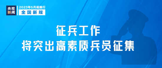 新修订的《征兵工作条例》5月1日起施行。本次修订有六大创新点,包括突出高素质兵员征集,建立综合考评择优定兵机制,明确以大学生为重点征集对象,优先保证高校毕业生和对政治、身体条件或者专业技能有特别要求的兵员征集;符合条件的退役士兵可以再次入伍,并优先安排到原部队或同类型岗位等。