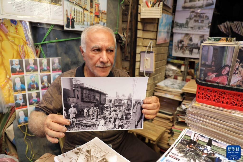4月25日,在伊拉克首都巴格达,“菲尔菲里”书店老板菲尔菲里展示拍摄于1936年的巴格达街景照片。新华社发(哈利勒·达伍德 摄)