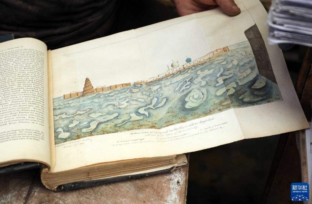4月19日,在伊拉克首都巴格达,“阿斯里”书店的前老板法卢吉介绍店面早期情况。新华社发(哈利勒·达伍德 摄)