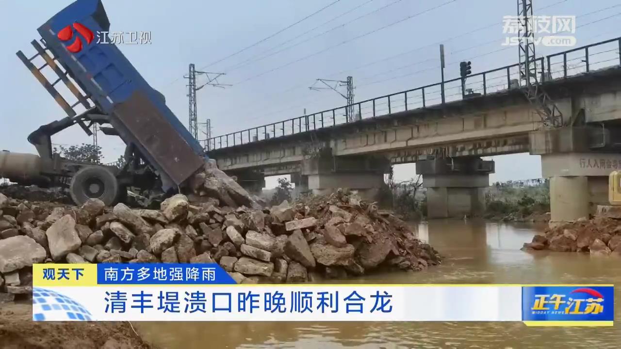在抢险人员连续奋战29小时后,5月7日18时许,随着多辆作业机械将最后一车土石块倒入决口处,江西省丰城市京九线铁路桥下清丰堤溃口顺利封堵。