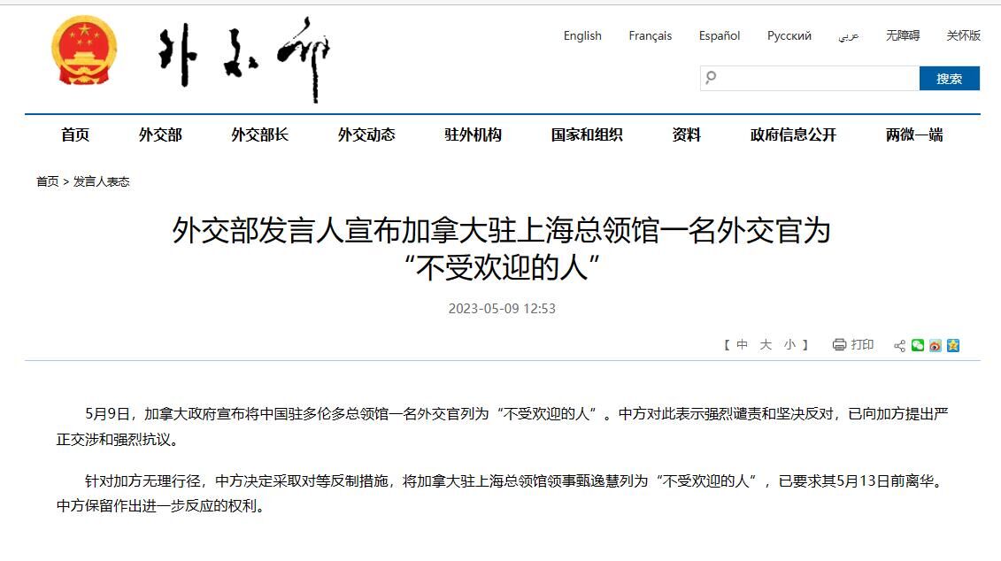 5月9日,加拿大政府宣布将中国驻多伦多总领馆一名外交官列为“不受欢迎的人”。中方对此表示强烈谴责和坚决反对,已向加方提出严正交涉和强烈抗议。