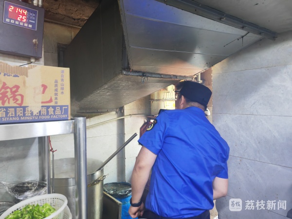 5月11日上午,南京市鼓楼区中央门街道环保、安监、城管等多部门与城市治理公众委员、城市治理志愿者、城市管理网格员等一起,组成联合检查组,对三牌楼大街上的小餐饮单位进行了执法检查。在一家餐饮店铺里,检查人员重点检查了门店油烟机的清洗情况。“上班第一件是把燃气阀门打开,下班的时候我们会检查燃气开关,晚上也是一样,有专人负责,烟道三个月清洗一次,定期检查,下班的时候也会看有没有漏油,比较脏的话两个月就洗一次。”餐饮店负责人说。