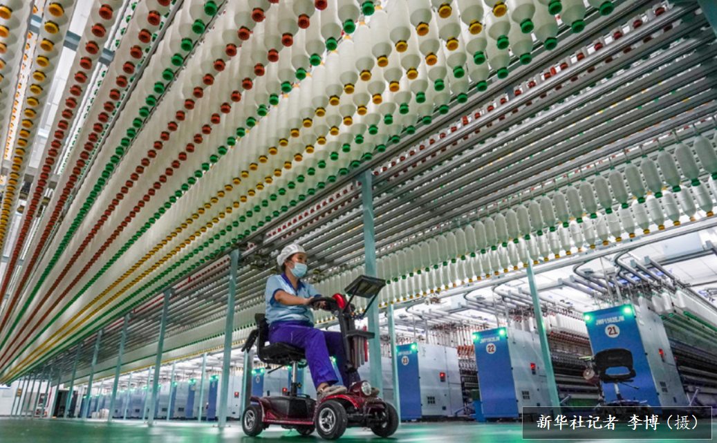 纺织工人在江苏大生集团有限公司数字化纺纱车间内作业