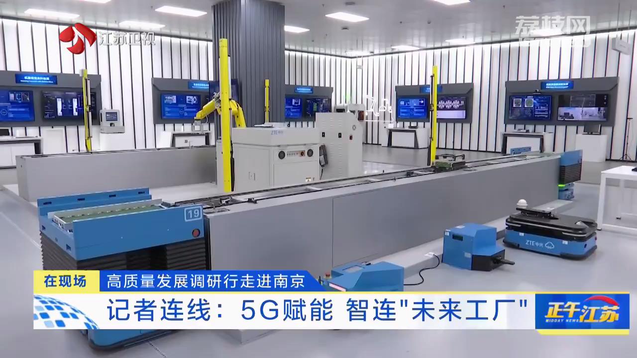 江苏台记者许啸:“我现在所在的地方是中兴通讯南京5G智能制造基地,今天的智能制造基地迎来了一群特殊的参观者,他们用手中的摄像机、照相机、录音笔来记录当地智能化转型发展的成果。中兴通讯南京5G智能制造基地位于南京滨江开发区,项目总投资200亿元,也是该企业在光电子产品研发、生产、销售的全球总部,同时中兴利用5G技术对制造基地进行全流程改造,完成从研发、生产、运营的全流程智能化。现在我所处的位置是企业的5G智能工厂,还有个别称叫做黑灯工厂,今天为了采访团的调研需求,也是将工厂内的灯光全部打开。平时这里的灯光都是关闭的,和传统工厂不同,这里不需要工作人员投入生产,而是通过一支支精准高效的机械手臂,一辆辆自动找人找货的无人搬运车,进行产品的生产、组装、测试等各个环节,该工厂投产后对产品生产有了怎样的提升,马上请出我身边的赵部长。”