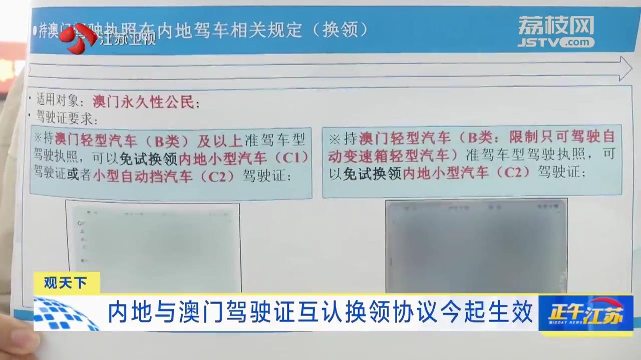 江苏台记者董雯:根据内地与澳门驾驶证互认换领协议,内地与澳门承认对方核发的有效驾驶证,一方准许持有对方驾驶证的人员直接驾车或者免试换领驾驶证。互认换领的驾驶证准驾车型包括了小型汽车和小型自动挡汽车。