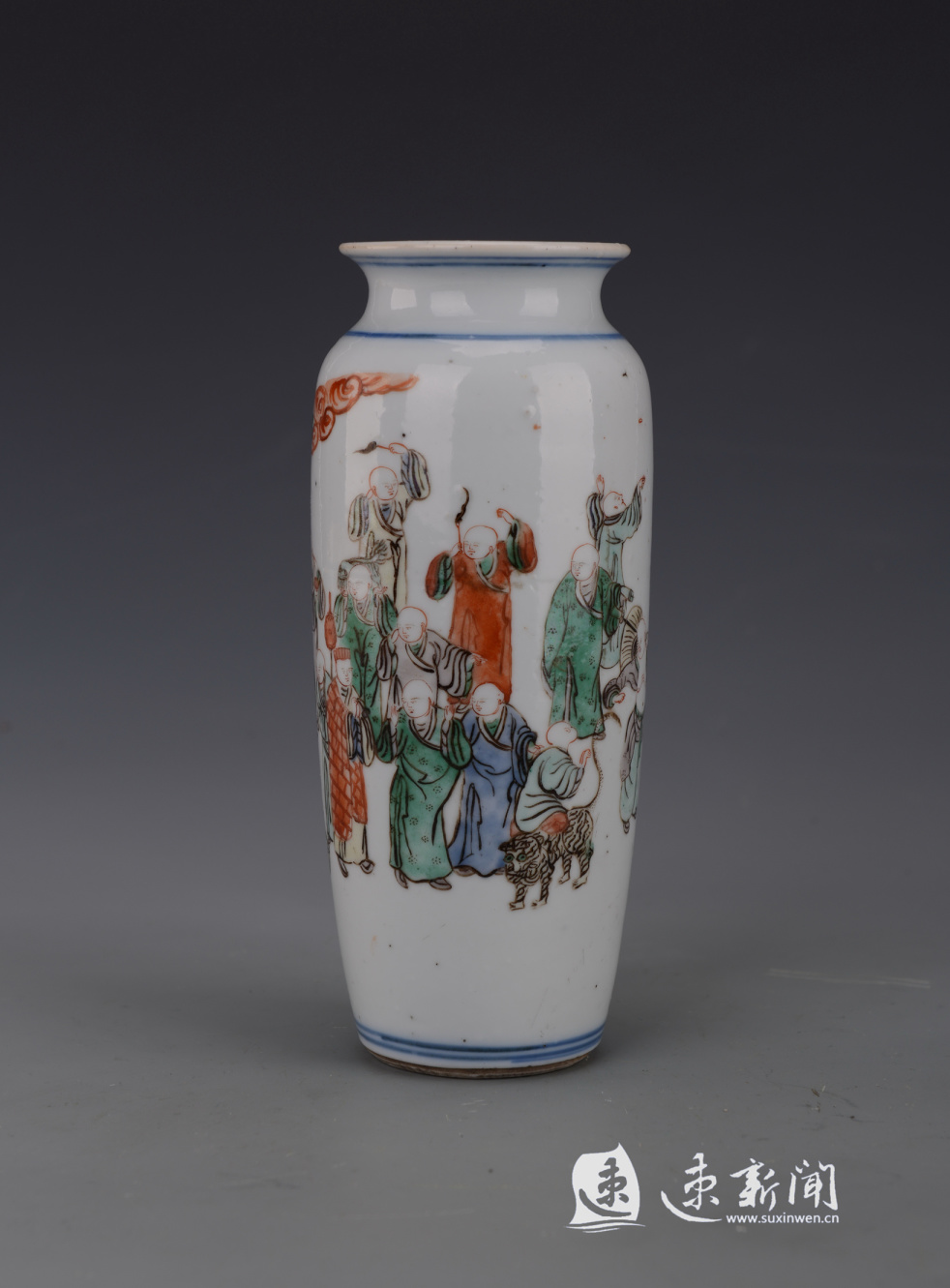 敞口,短颈,筒式腹,饰五彩十八罗汉图。