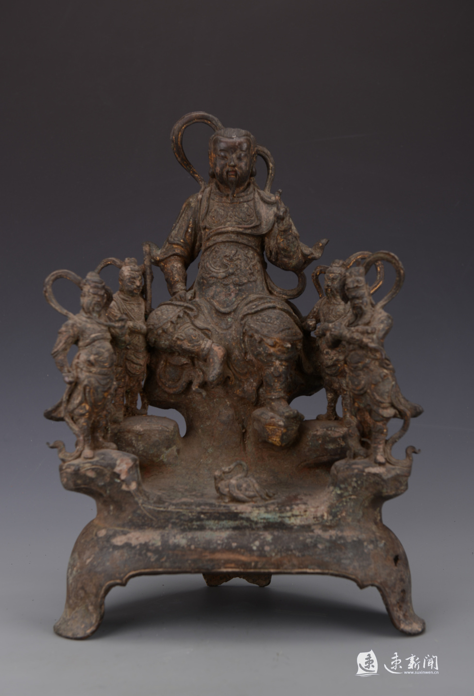 铜像由一大四小神像合铸而成,主神为真武大帝,助其降魔的四帅分列左右,前端为龟蛇灵兽,背部雕刻47字铭文:“寿州下蔡大山东信士马铠同子马儒等合家共发心奉请祖师并四帅等金火匠黄柏嘉靖四十一年十一月十五日请”。据铭文可知该铜造像为嘉靖四十一年寿州信士马氏父子一家所请。器物保存完好,形象生动,组合完整,纪年准确,是明朝真武信仰最为昌盛时期的实物见证。