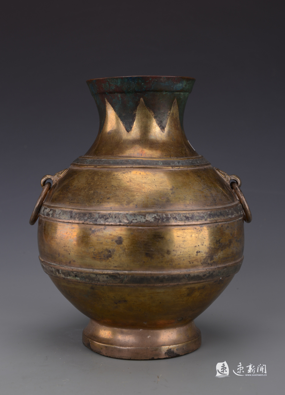 通体鎏(liú)金,细长颈,圆腹,广圈足微向外撇,口沿部有一圈三角形纹,腹部有两对称铺首衔环。