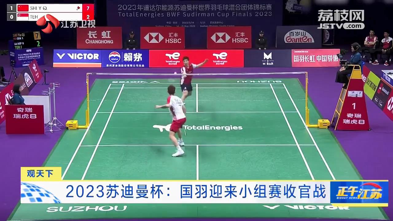 江苏台记者陈哲天:“今天下午五点中国羽毛球队小组赛的收官之战即将打响,国羽将迎来强敌丹麦队的挑战。所谓狭路相逢勇者胜,丹麦队男单选手安赛龙的技战术水平不容置疑。曾摘得东京奥运会冠军的他,目前男单排名世界第一。”
