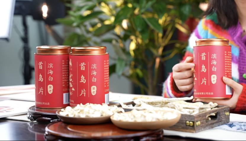 一部智能手机、一个支架、一台补光灯,首乌片、首乌花、首乌粉等首乌制品依次摆开,简单的设备加上优质的农产品,韩沛栩热情洋溢地为本地农产品代言推介。从白首乌良好的生长条件到白首乌与何首乌的区别、白首乌的功效与经济价值等,加上对产品形态品质和自我体验的描述,直播间吸引了众多网友观看。