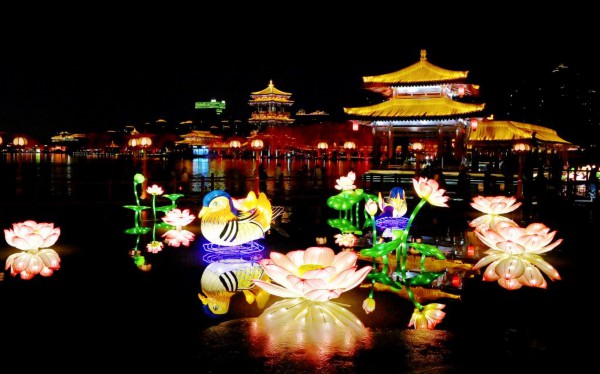2023年1月24日在西安大唐芙蓉园拍摄的花灯(无人机照片)。新华社记者 刘潇 摄