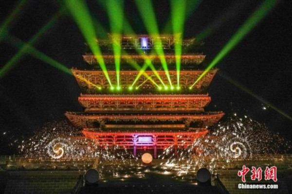 山西运城永济市,打铁花表演在鹳雀楼景区上演。 中新社记者 武俊杰 摄