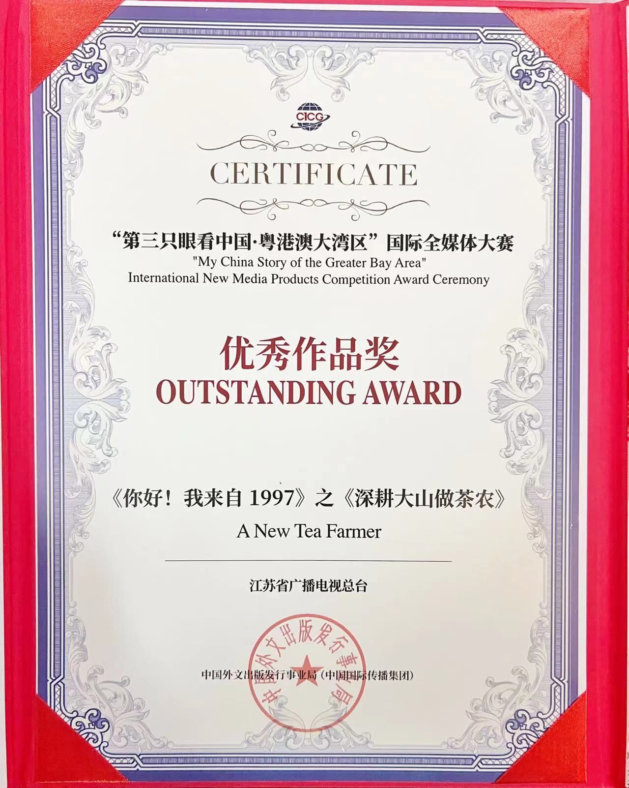 6月2日,由中国外文局主办的“第三只眼看中国·粤港澳大湾区”国际全媒体大赛颁奖典礼系列活动在广东中山举行。其中,由江苏省广播电视总台拍摄制作的《你好!我来自1997》系列微纪录片之《深耕大山做茶农》(点击查看>>),在大赛短视频类作品单元中获优秀作品奖。