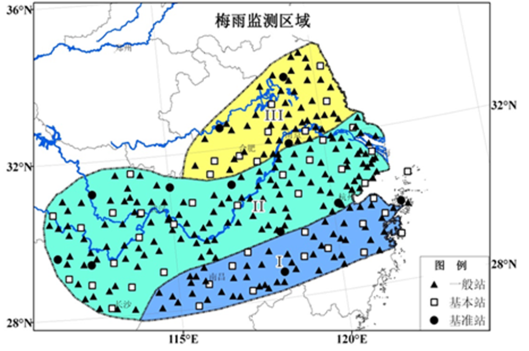 国家气候中心依据国标《梅雨监测指标》开展梅雨实时监测业务。如上图所示,梅雨监测区域划分为3个区域,即江南区(Ⅰ)、长江中下游区(Ⅱ)、江淮区(Ⅲ)