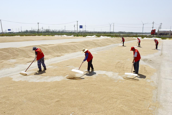 “三夏”支援突击志愿者在场头翻晒(央广网发 通讯员供图)