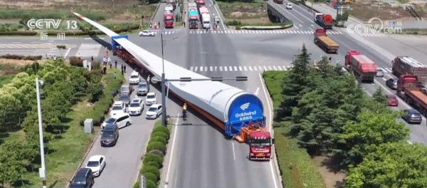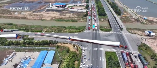 总台记者 毛俊:这里是连云港市大浦路和228国道的交叉路口,现在是上午10时30分,今天转运的一组三只123米的海上风电叶片已经抵达了这里。现在第一只叶片正在准备通过我身旁这个90度的大弯,特别重、特别长、不能磕碰都是123米长大叶片过弯的难题。