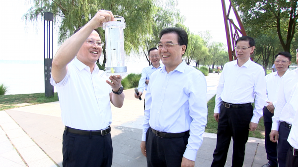 14日早上8:30,全体省委常委集中乘车,奔赴此次调研首站——南京幕燕滨江风貌区。一下车,大家立刻感受到浓浓的绿意,沿江边步行,仿佛置身生态公园,江水清朗、草木荫荫,令人心旷神怡。此时,天空中一阵隆隆声引起大家注意。原来,南京市生态环境监测监控中心的无人机正在江面上采样取水作业。无人机分三次,随机在长江中采样,将江水样本带到岸边。工作人员现场检测,报告结果:江水样本均达到二类水标准。
