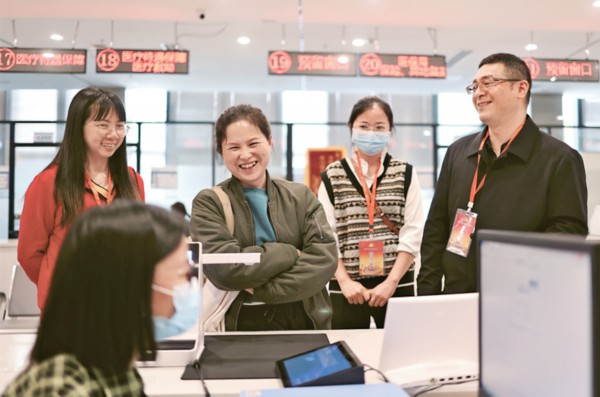 2023年5月23日,湖南省通道侗族自治县政务服务中心,纪检监察干部向办事群众了解窗口工作人员服务情况。 人民图片 李尚引/摄