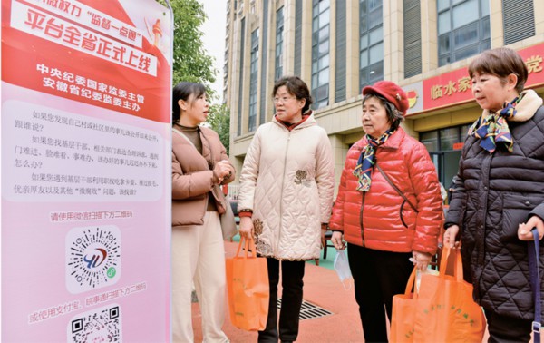 2023年2月17日,安徽省合肥市蜀山区井岗镇纪委和卫楼社区工作人员在引导居民关注了解小微权力“监督一点通”平台相关知识。 中新社发 葛宜年/摄