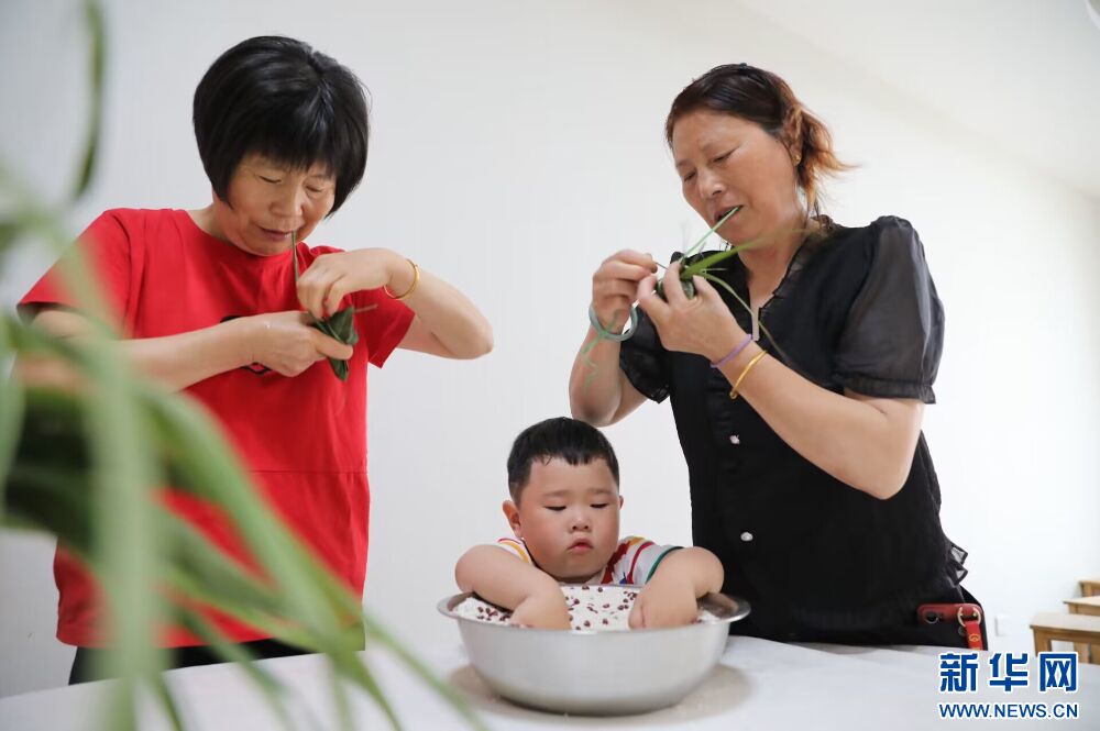 几片清香四溢的粽叶,一把雪白的糯米,数根丝线,在手间纷飞缠绕,转眼就变为绿莹莹的粽子。图为苏州相城区渭塘镇西湖村的志愿者在为独居老人包粽子。(胡永春 摄)