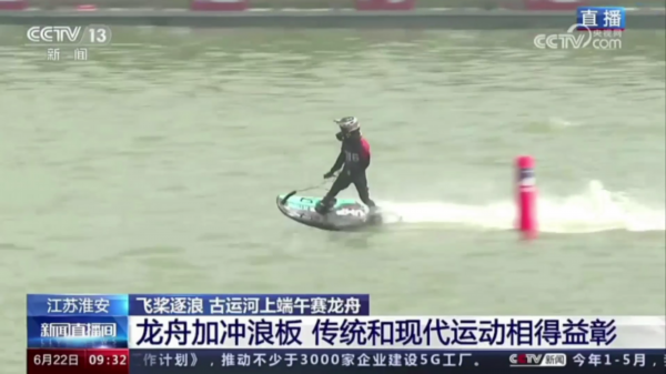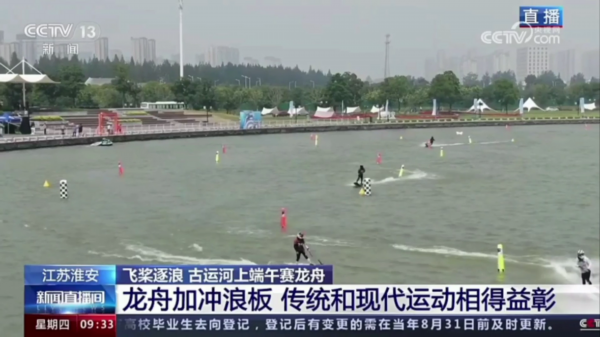 今天的里运河上,我们不仅能够看到传统的龙舟赛,2023全国动力冲浪板比赛也在同步进行,传统和现代运动相得益彰,这也是淮安今年端午节活动的最大亮点。这场动力冲浪板比赛也是一场国家级赛事,五颜六色的冲浪板在里运河清澈的水面上点缀出斑斓的色彩,身姿矫健的运动健儿们尽情展现着这项运动的魅力。