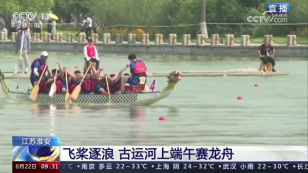 淮安里运河是京杭大运河最早修建的一段,淮安更是运河上重要节点城市,自古以来就是南船北马、舍舟登陆的交通要道。今天的比赛赛道长300米,共6个赛道,每个赛道宽9米,6支龙舟队72名队员都是淮安的龙舟爱好者。