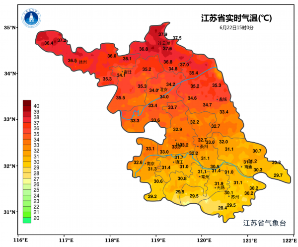 15时,淮北大部分地区的实时气温都在35℃以上,其中赣榆(37.9℃)、连云港(37.6℃)、西连岛(37.5℃)、沛县(37.2℃)、响水(37℃),已经越过了37℃线。