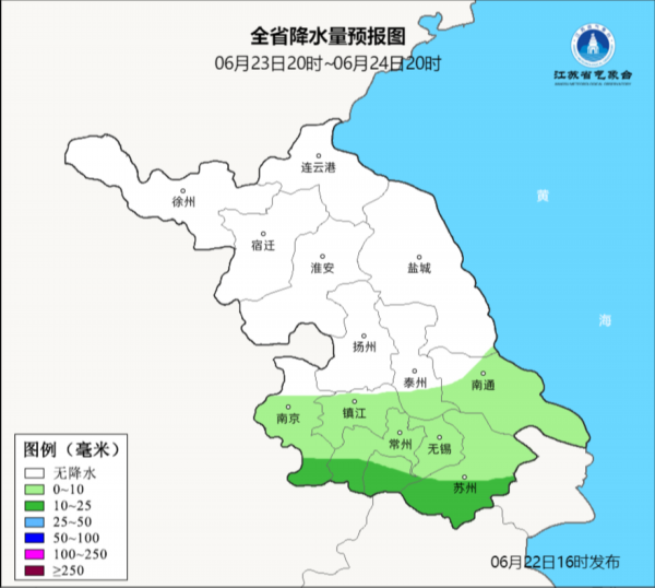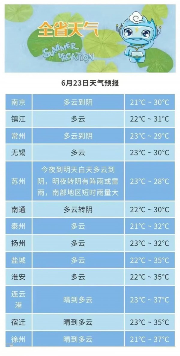 23日白天全省以多云天气为主,淮北地区有高温,夜里起全省自南向北有一次降水过程。