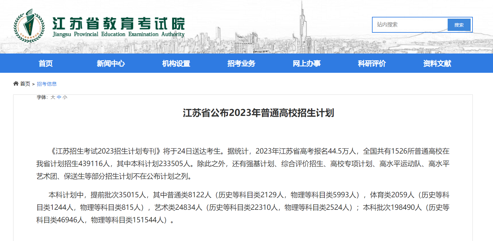 《江苏招生考试2023招生计划专刊》将于24日送达考生。据统计,2023年江苏省高考报名44.5万人,全国共有1526所普通高校在我省计划招生439116人,其中本科计划233505人。除此之外,还有强基计划、综合评价招生、高校专项计划、高水平运动队、高水平艺术团、保送生等部分招生计划不在公布计划之列。