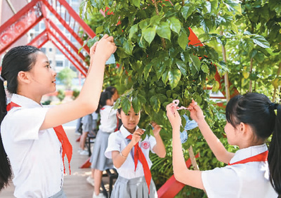 6月20日,在广西壮族自治区玉林市兴业县第一实验小学,学生们将制作好的香囊挂在树上。
