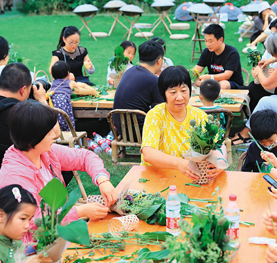 6月22日,人们在上海市闵行区华漕镇举行的端午活动上制作艾草小提篮。