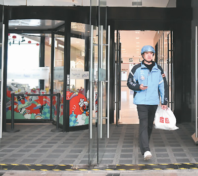 配送员在一家商场店铺取到外卖订单物品准备送货。