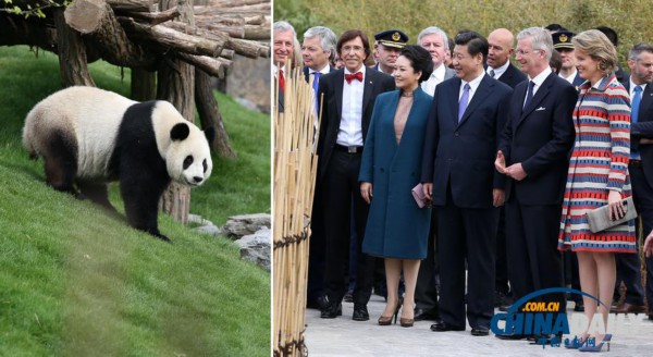 The combo photo taken on March 30, 2014 shows President Xi Jinping (3rd R, front), his wife Peng Liyuan (4th R, front), Belgian King Philippe (2nd R, front), Queen Mathilde (front R) and Belgian Prime Minister Elio Di Rupo (5th R, front) visiting the panda house at the Pairi Daiza zoo in Brugelette, Belgium. [Photo/Xinhua]