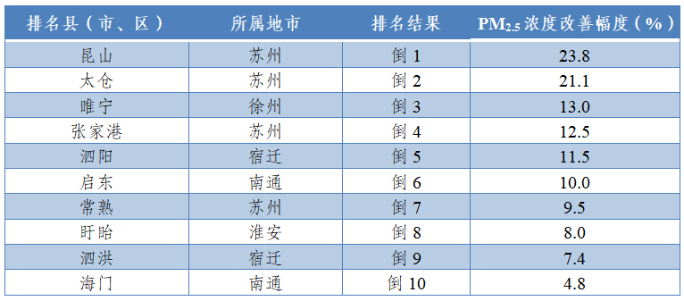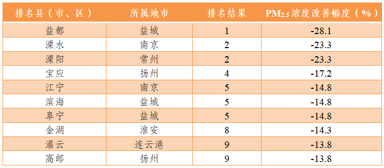 PM2.5浓度改善幅度相对较好的前10位(1-10名)依次是: