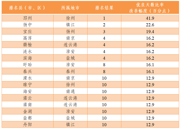 优良天数比率改善幅度相对较好的前10位(1-10名)依次是:
