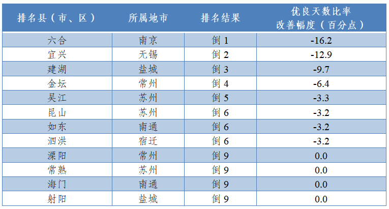 优良天数比率改善幅度相对较差的后10位(倒1-10名)依次是: