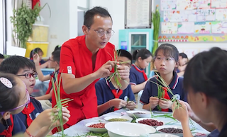 包粽子、吃“五红”、挂蛋兜、做香囊是溧水本地人端午节的传统民俗,为了让更多小朋友感受到传统文化的乐趣和魅力,今年当地学校结合溧水当地盛产螃蟹的特点,专门邀请非遗传承人走进学校,在端午主题班会上向同学们展示别具特色的“螃蟹粽子”的制作方法。