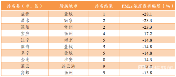 PM2.5浓度改善幅度相对较好的前10位(1-10名)依次是:盐都、溧水(溧阳并列)、宝应、江宁(滨海、阜宁并列)、金湖、灌云(高邮并列)。
